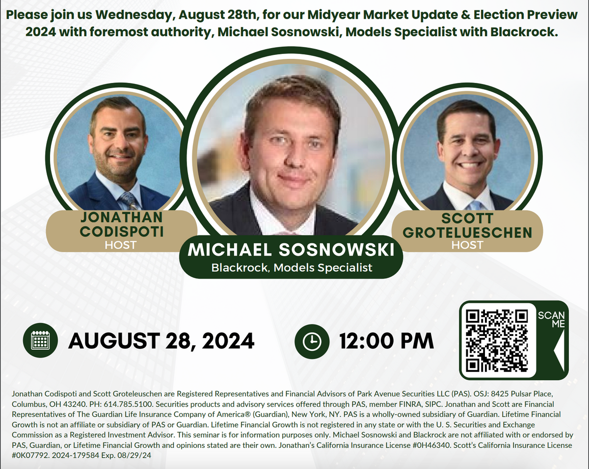 You're invited to a webinar designed to help you understand the major changes in today's economy. New technologies like AI, clean energy, and shifts in production are transforming the market. With uncertainties around these changes and challenges like inflation and rising debt, this webinar is perfect for investors who want to stay informed and make smart decisions. Please join us Wednesday, August 28th, for our Midyear Market Update & Election Preview 2024 with foremost authority, Michael Sosnowski, Models Specialist with Blackrock.